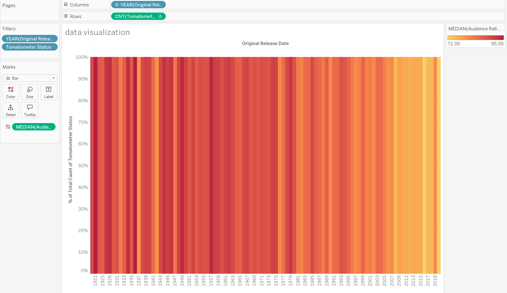 The median score of audience ratings were taken for all movies rated FRESH and visualized with a red-gold gradient palette.
